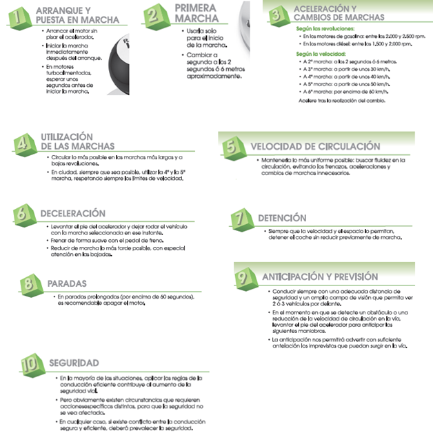 Los diez pasos para una conducción eficiente se pueden sintetizar en:
